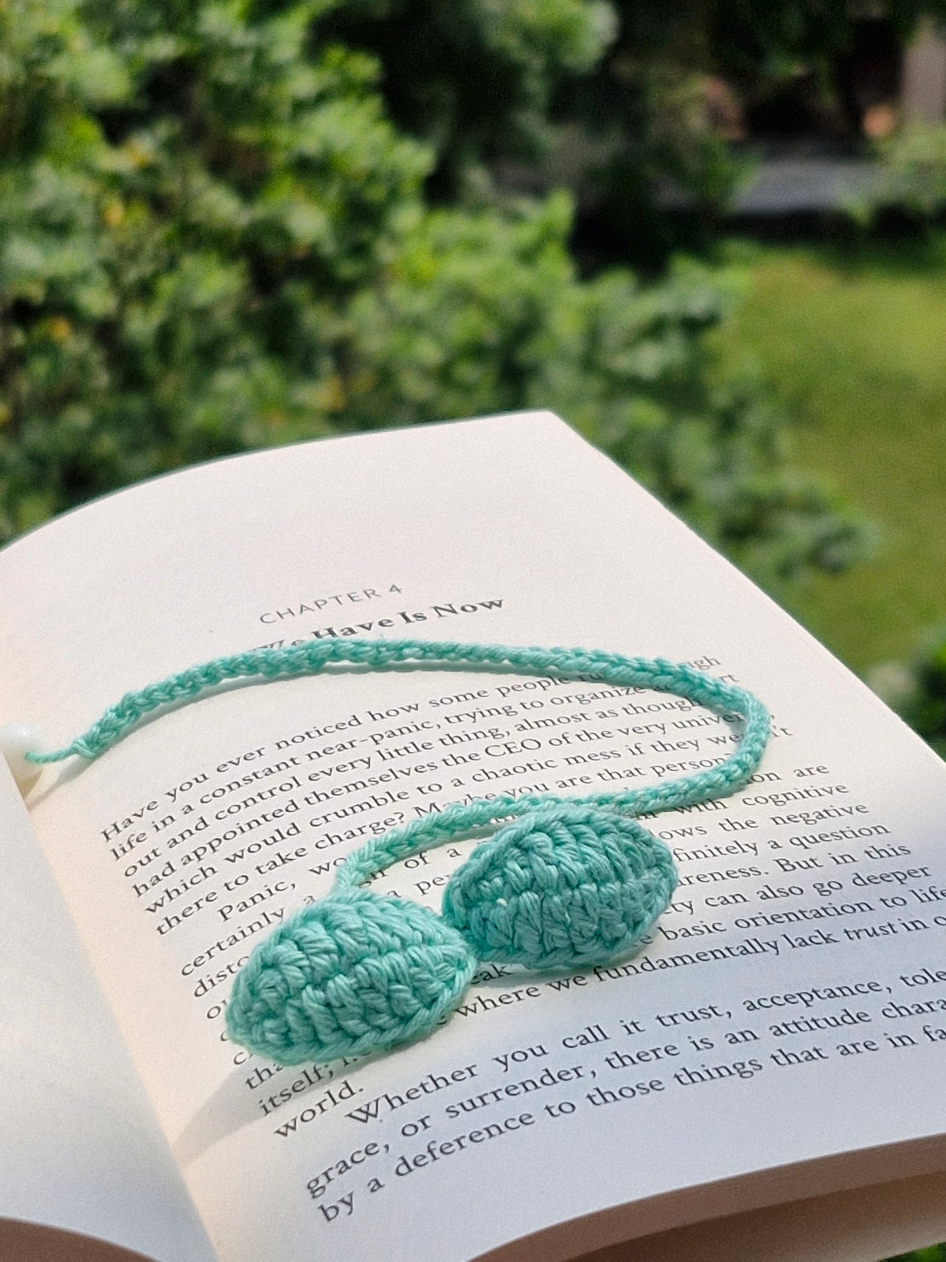 Leaf Crochet Bookmark. Perfect for any book lover, this handmade bookmark features a delicate leaf design and adds a touch of whimsy to your reading routine. Never lose your spot again with this fun and practical accessory!
