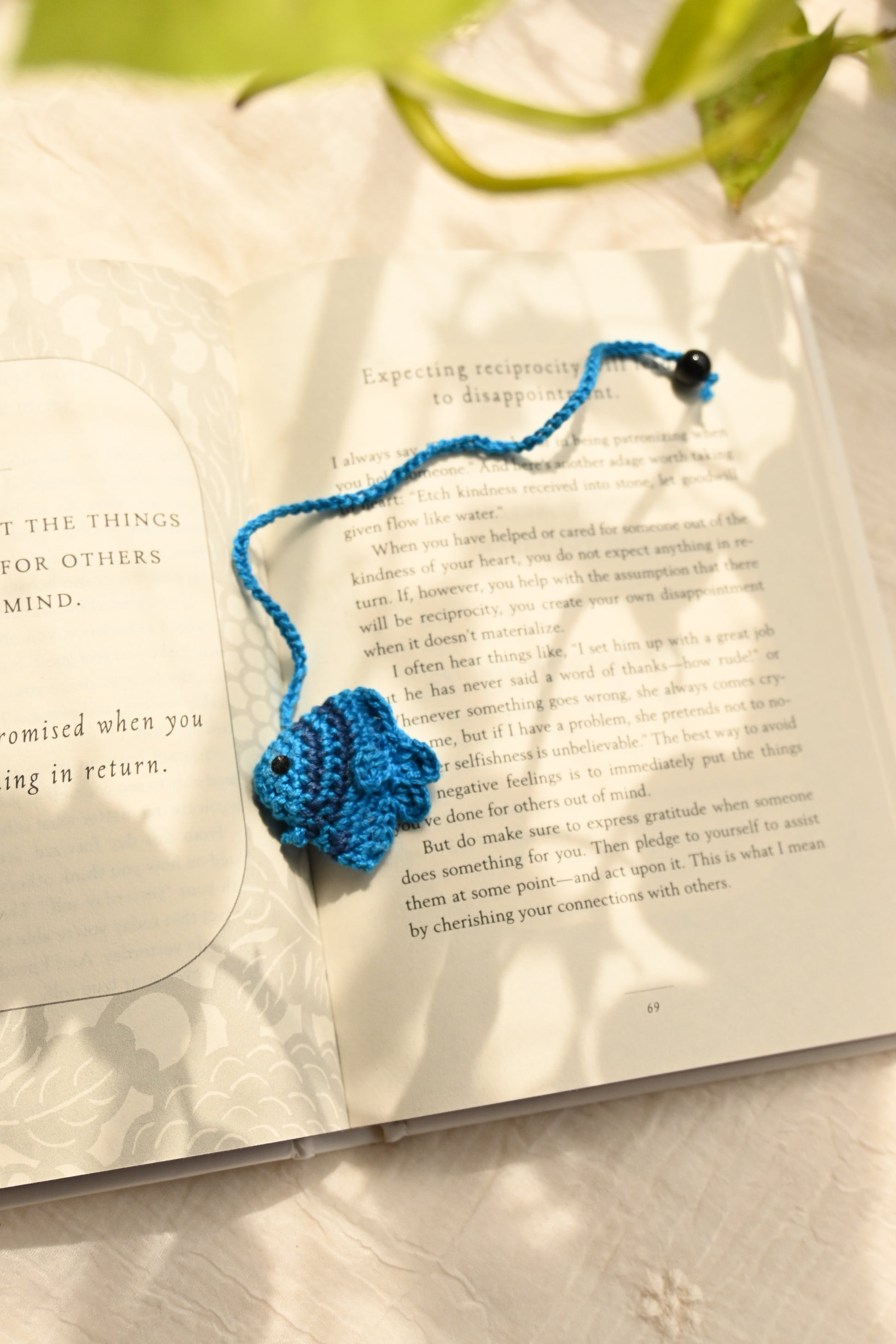 The vibrant blue tones and tiny stitched details give this bookmark a playful personality, while its flexible, lightweight form ensures it rests gently between your pages without causing creases or damage. The extended crochet tail adds a whimsical flair and helps you quickly find your spot.